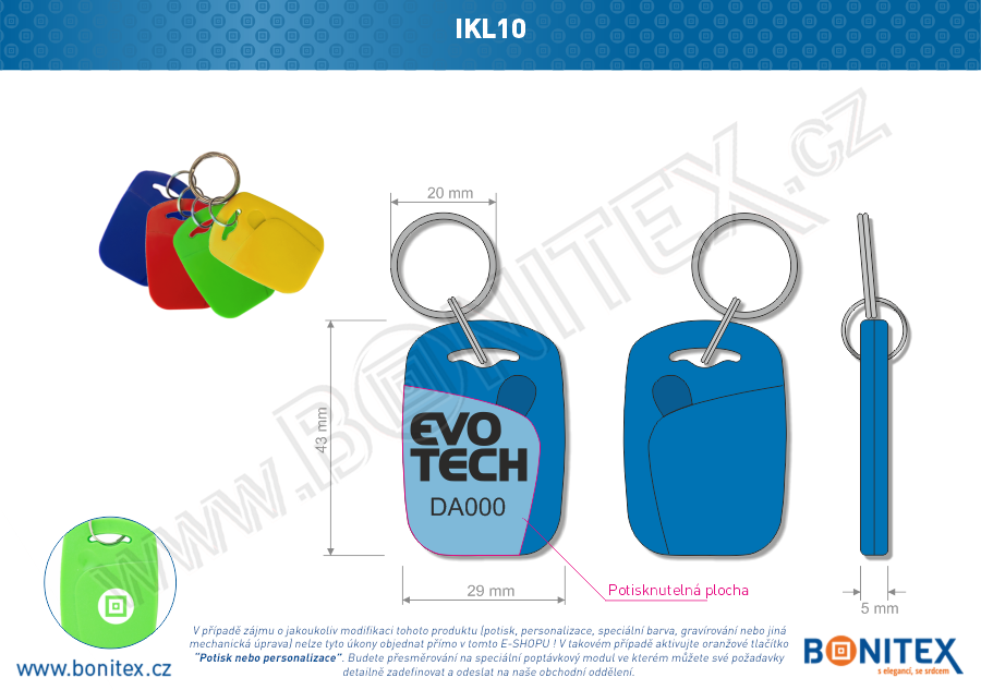ABS klíčenka v modrém provedení s bezkontaktními RFID DUO čipy na frekvencích 13,56 MHz a 125 kHz je vybavena spolehlivými čipy NXP-Mifare DESFire EV1(2k) a EM4102. S rozměry 44x30 mm a tloušťkou 4,2 mm poskytuje spolehlivou identifikaci a zabezpečení. Ideální pro přístupové, identifikační, docházkové a jídelní systémy.