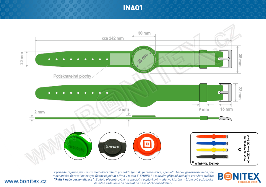 Silikonový identifikační náramek v zeleném provedení s bezkontaktním RFID čipem na frekvenci 125 kHz je vybaven spolehlivým čipem Atmel-ATA5577. S rozměry 242x20 mm je vhodný pro přístupové a identifikační systémy aquaparků, bazénů, saun a dalších zařízení, nejen sportovních.