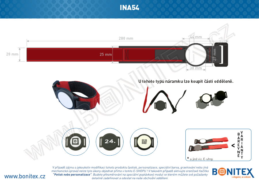 Nylonový náramek s samostatnou nylonovou páskou (285x25 mm) s suchým zipem; Tento černo-červený nylonový identifikační pásek k čipu INA54 má rozměry 280x25 mm a je vybaven suchým zipem. Ideální pro použití v přístupových a identifikačních systémech v aquaparků, bazénů a saun.